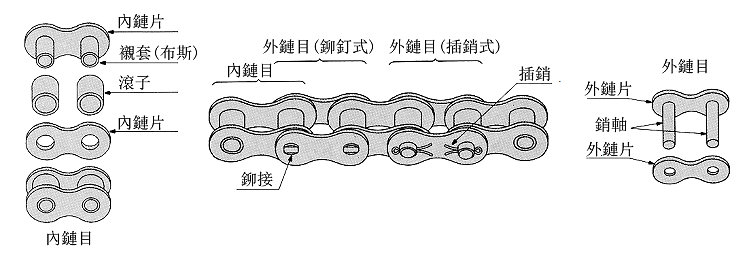 鏈條主要由鏈片、襯套、銷軸與滾子而組成,如上圖所示。滾子鏈條又依鏈片不同的固定方式而分成A.鉚接式和B.插銷式。
