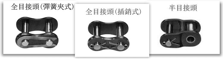 接頭為連接鏈條兩端之物件,分為全目接頭和半目接頭,全目接頭又因不同的固定方式分為彈簧夾式與鉚接式接頭。(如下圖所示)